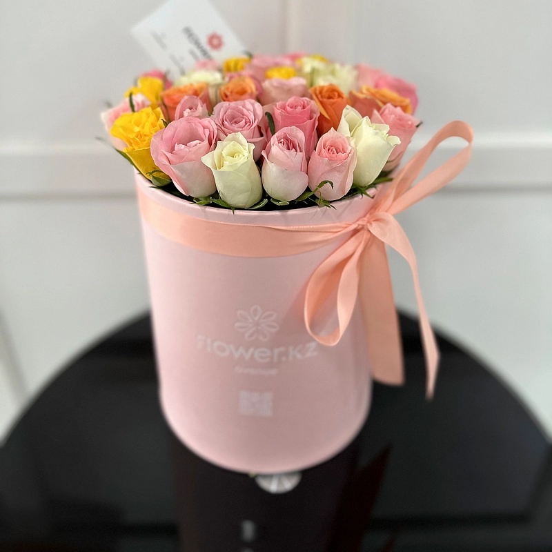 35 микс роз в розовой коробке-тубус