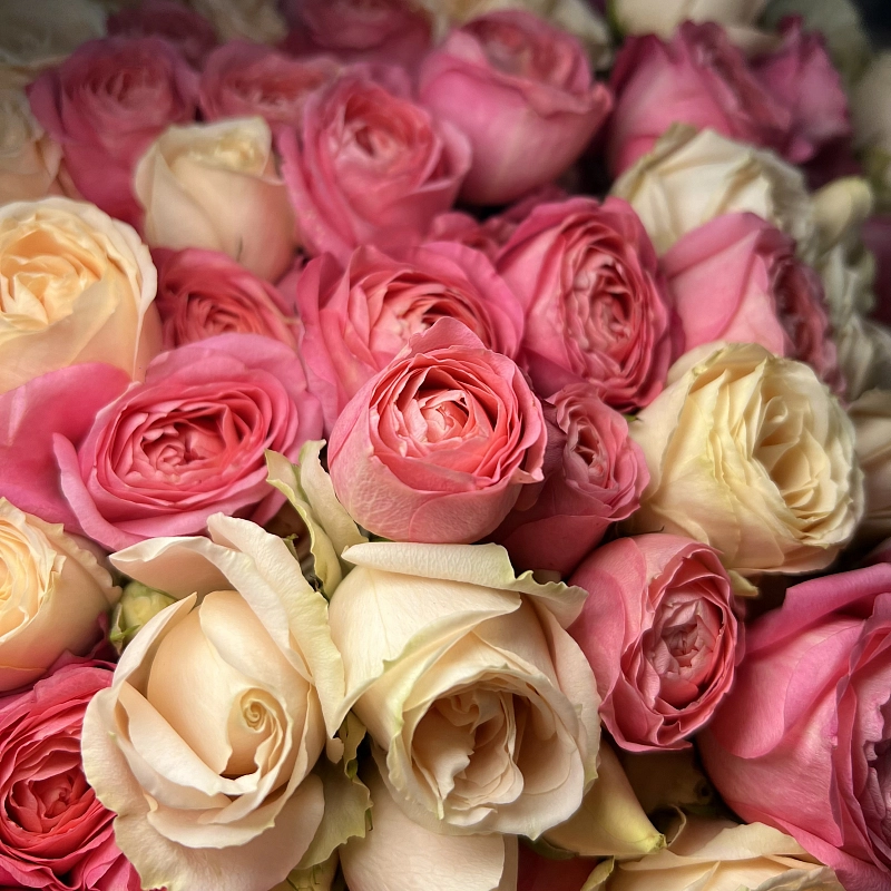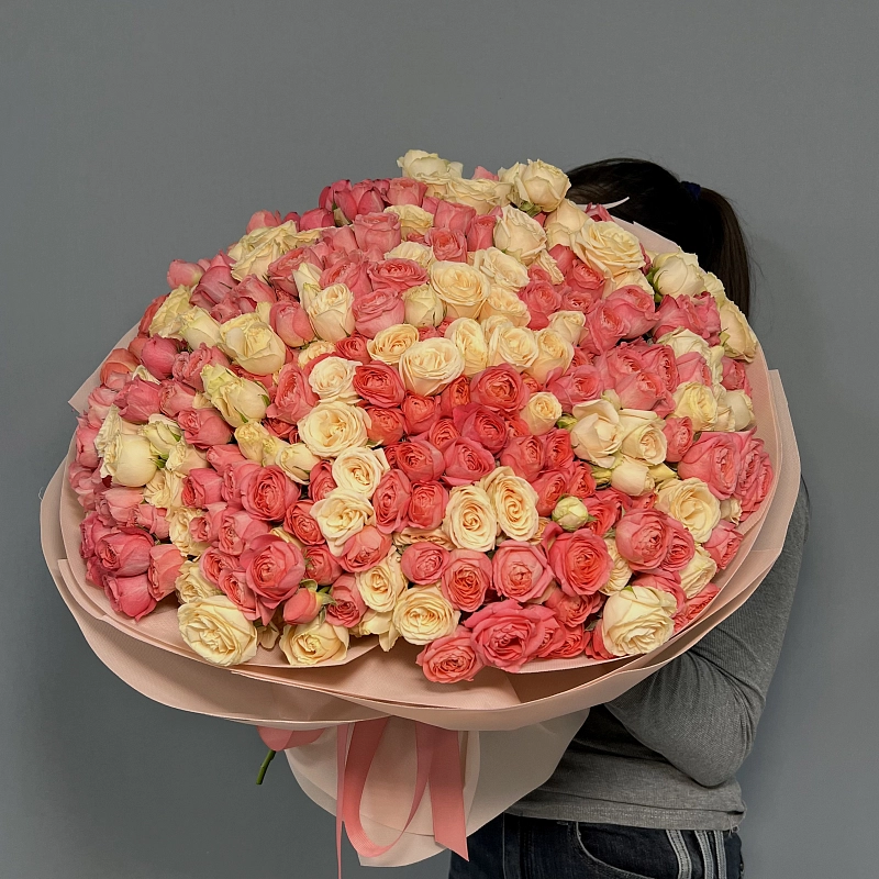 Букет из 101 микс кустовой розы "Тянь-Шань" - впечатляющая, по-настоящему роскошная композиция. Сотни нежных бутонов, богатство оттенков и пышный объём создают эффект абсолютного восторга. Этот букет говорит о чувствах без слов и превращает любой момент в событие.