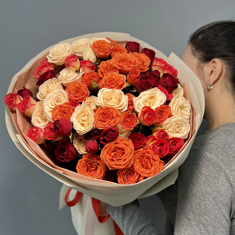 Букет из 51 микс кустовой розы "Тянь-Шань" эффектная и пышная композиция из множества нежных бутонов. Гармоничное сочетание оттенков, свежий аромат и аккуратная сборка создают ощущение роско...