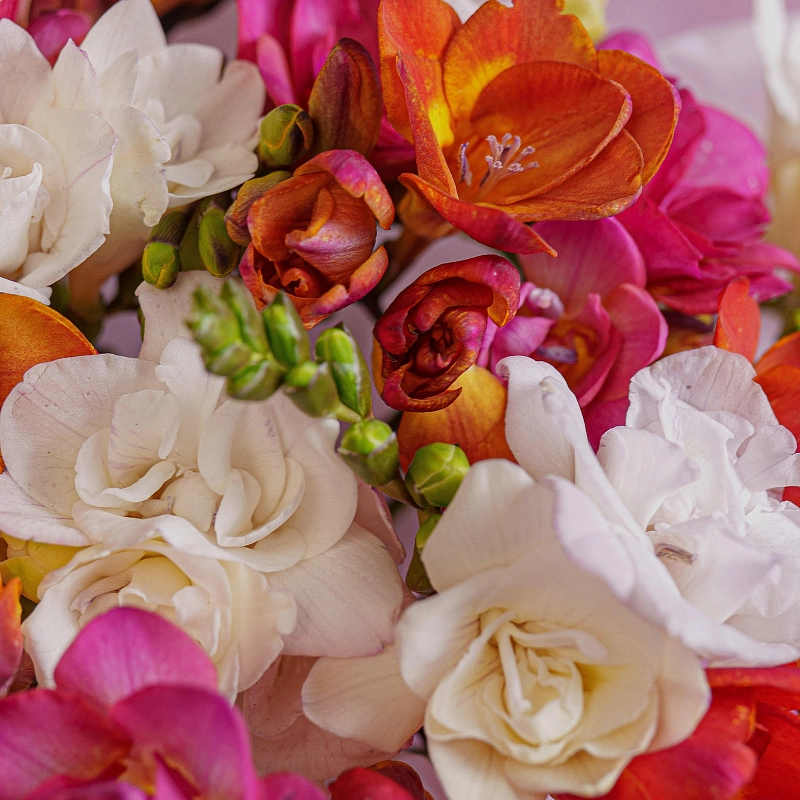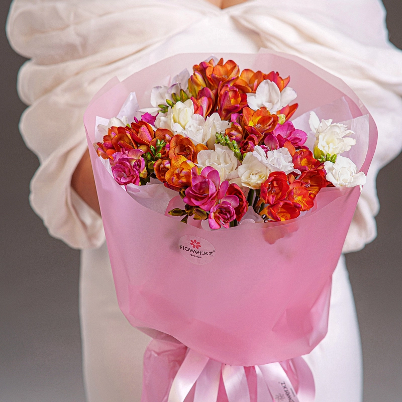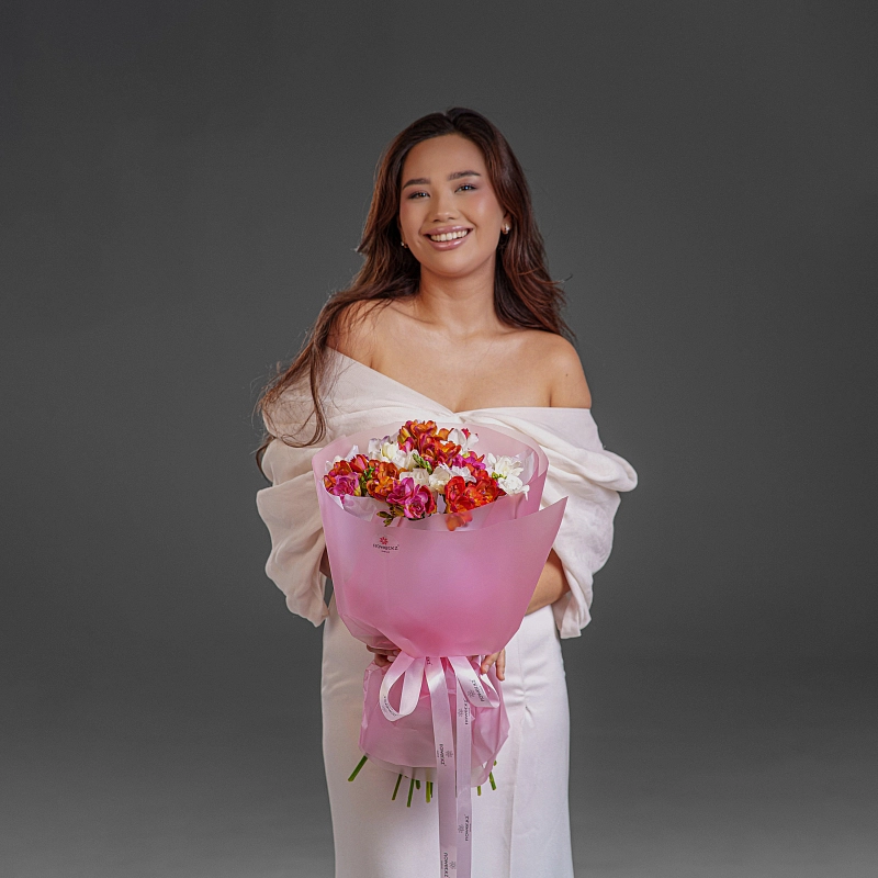 Букет из 25 микс фрезий — это нежность, свежесть и утончённый аромат в одном оформлении. Разноцветные фрезии создают лёгкое, воздушное настроение и наполняют пространство весенней гармонией. Каждый цветок символизирует искренность чувств и заботу, делая букет идеальным подарком для признаний, благодарности или просто тёплого знака внимания.