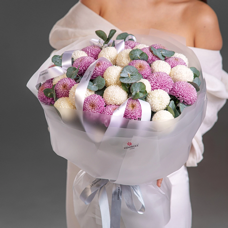 Букет из 35 хризантем Momoka в миксе белых и розовых оттенков — гармоничное сочетание нежности и свежести. Пышные соцветия создают объёмную, воздушную композицию, наполненную теплом и светлым настроением. Идеальный выбор для поздравлений, тёплых встреч и особых моментов.