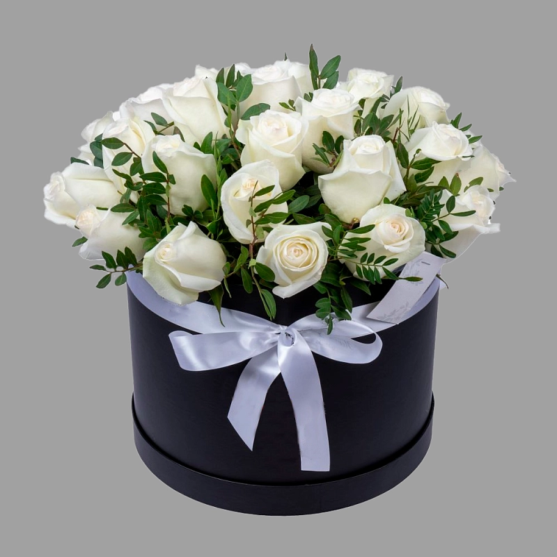 Композиция из 21 белых роз и зеленью в коробке - фото 1