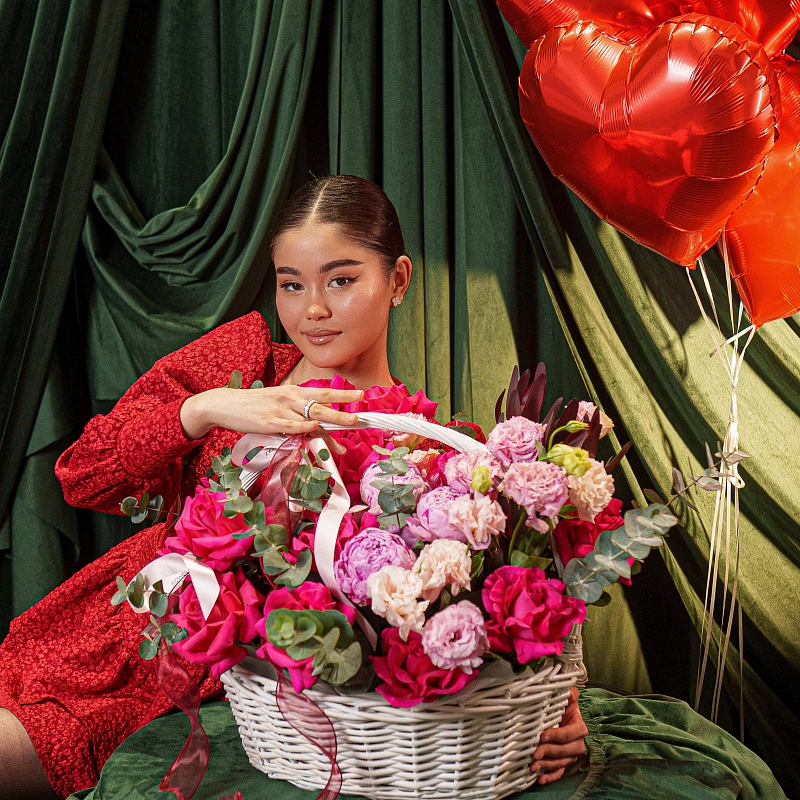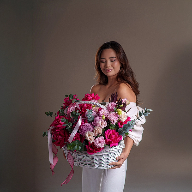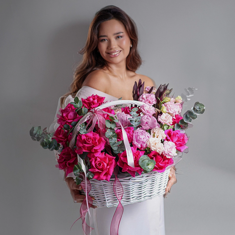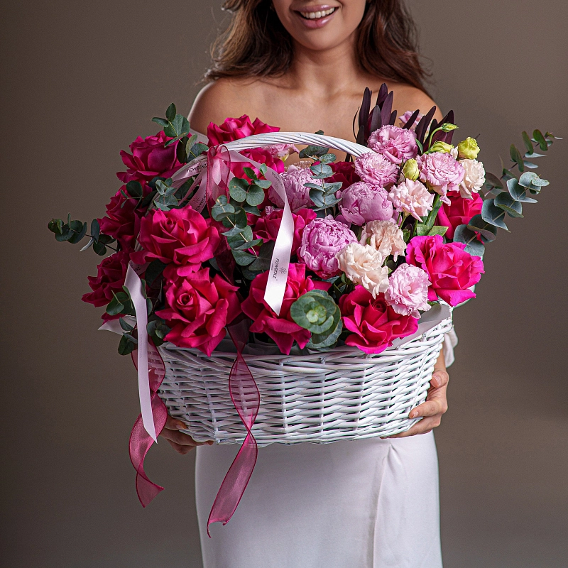 Корзина с пионами и розами "Шепот чувств" — нежная и утончённая композиция, наполненная романтикой и теплом. В составе — 14 роз, создающих пышный и гармоничный объём, 3 пиона сорта Sarah Bernhardt, придающих образу мягкость и изысканность, 3 лизиантуса, добавляющих воздушную текстуру, 3 леукодендрона, подчёркивающих природный стиль композиции, и украшенная зеленью, завершающий образ свежими зелёными акцентами. Корзина выглядит благородно и элегантно, идеально подходит для трогательных признаний, особых событий и искренних эмоций.