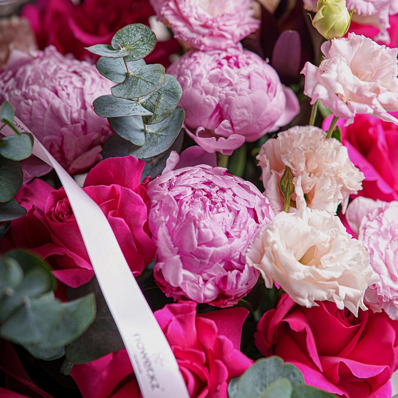 Ласковый букет состоит из пионов 9 шт, пионовидных роз 7 шт, кустовых пионовидных роз 5 шт, роз 3 шт, лизиантусов 5 шт и сухоцветов 5 шт. Цветы без повода — настоящий комплимент для любого случая, нап...