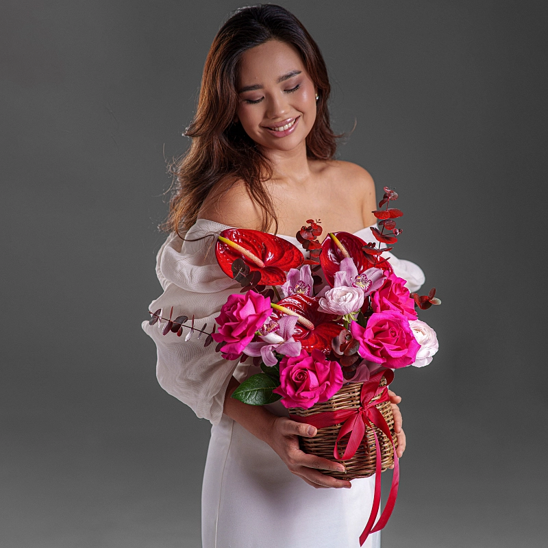 Корзинка с антуриумом "Pure love" — утончённая композиция, наполненная лёгкостью и гармонией. В составе — 3 антуриума, придающие образу выразительность и элегантную графику, 5 роз, добавляют теплоту и романтичное настроение, 1 ранункулюс вносит мягкий акцент и нежную фактуру, 3 орхидеи подчёркивают изысканность композиции, а зелень завершает образ свежестью и природной лёгкостью. Корзинка выглядит стильно и благородно, идеально подходит для признаний, поздравлений и особых моментов, наполненных любовью.