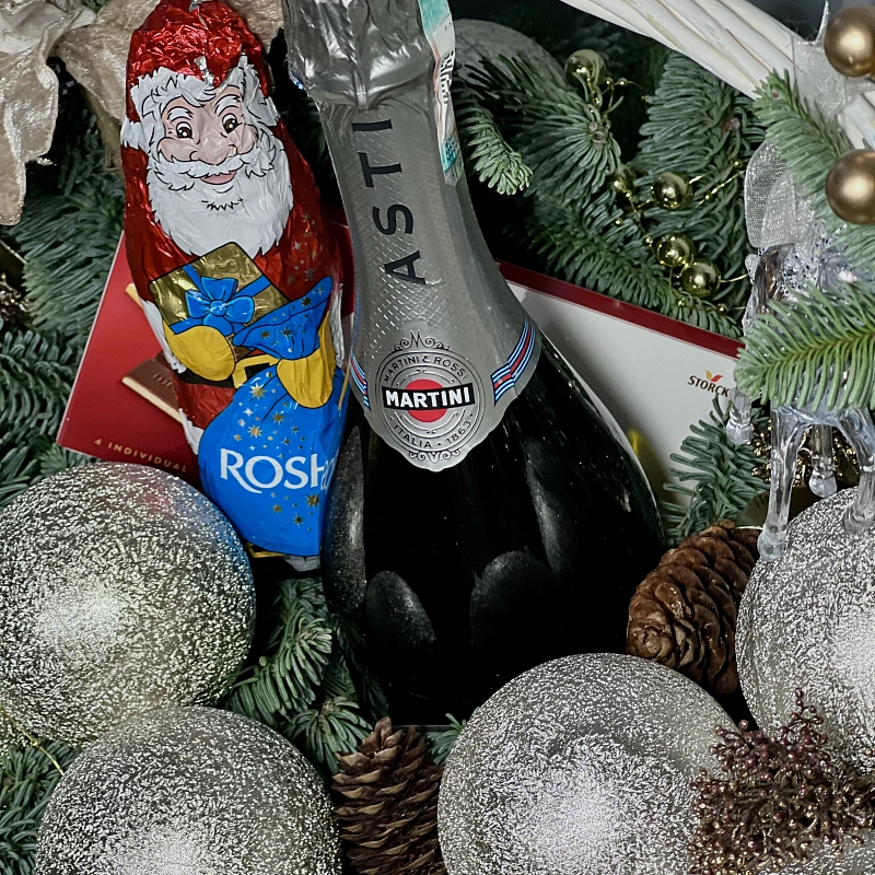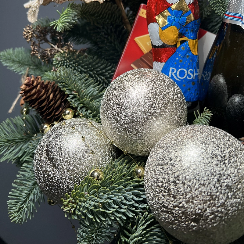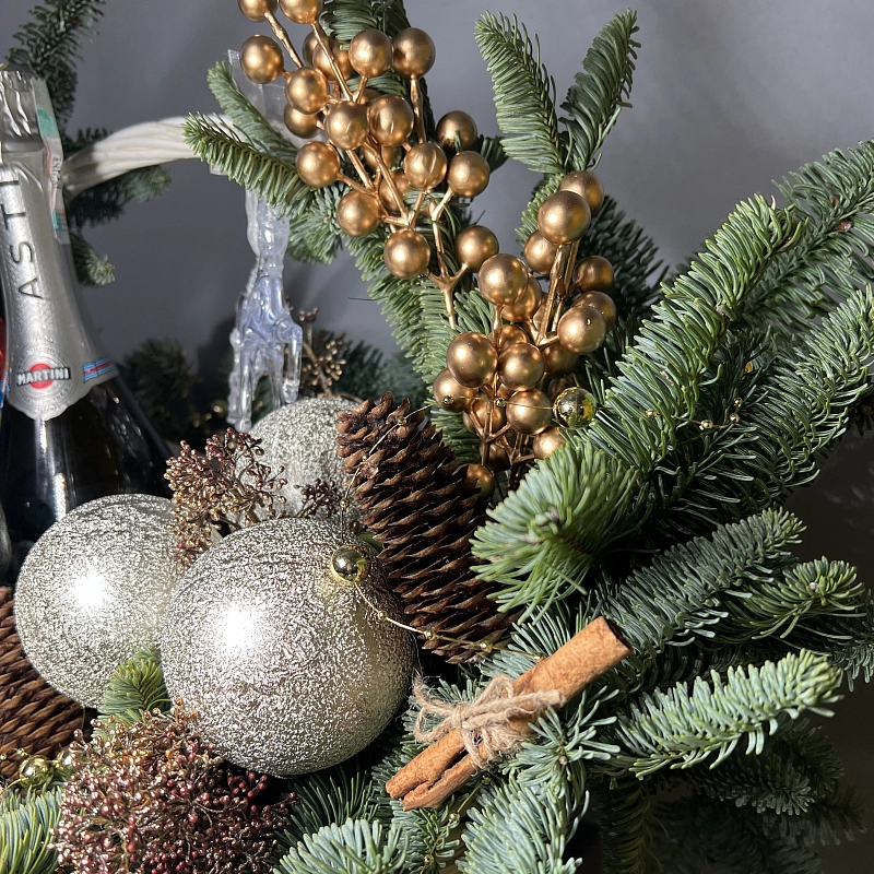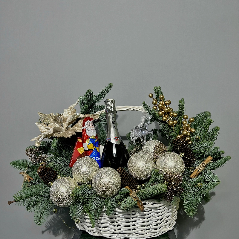 Новогодний набор "Ice crystal" — эффектная и праздничная композиция в холодной зимней гамме, созданная для стильного и запоминающегося подарка. Композицию в корзине наполняют 3 шт натурального елочного нобилиса, 4 шт скиммии, 6 шт шишек и 6 шт декоративных ягодок, 9 шт больших новогодних елочных шаров, нити бус, корица, елочная игрушка в виде "цветка" , игрушка фигурка "единорога", создают атмосферу зимнего волшебства. Набор дополнен игристым вином "Asti Martini", фигурным шоколадом в виде Деда Мороза "Roshen" весом 90 г и шоколадом "Merci" 100 г — полностью готовое решение для подарка без лишних хлопот.