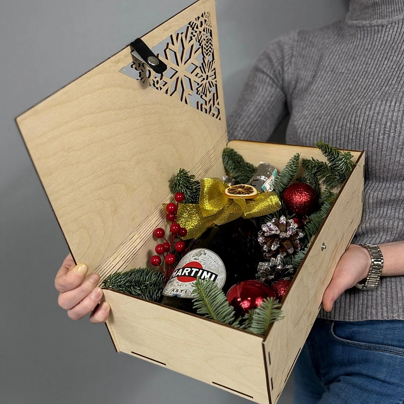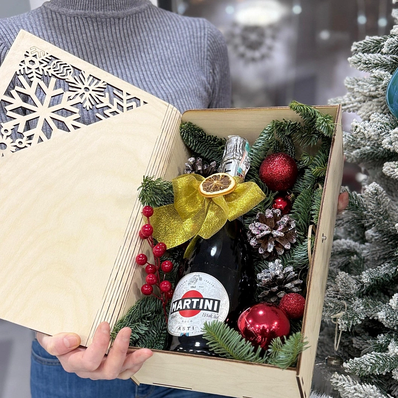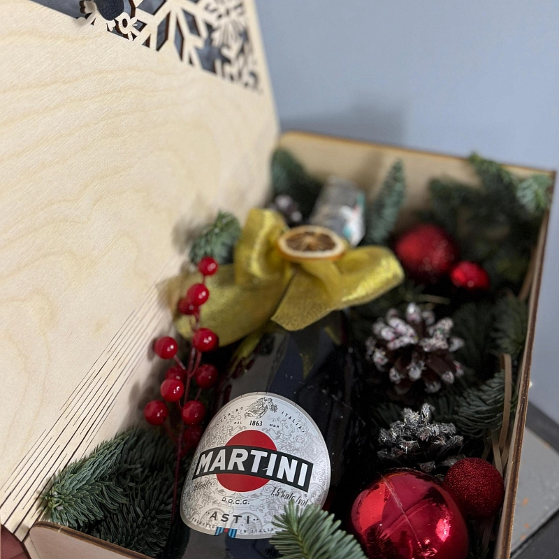 Новогодняя композиция "Holiday Vibes" — стильный и ароматный праздничный набор в деревянном ящике, в составе: натуральный елочный нобилис, игристое вино Asti Martini, набор конфет Merci 250 ...
