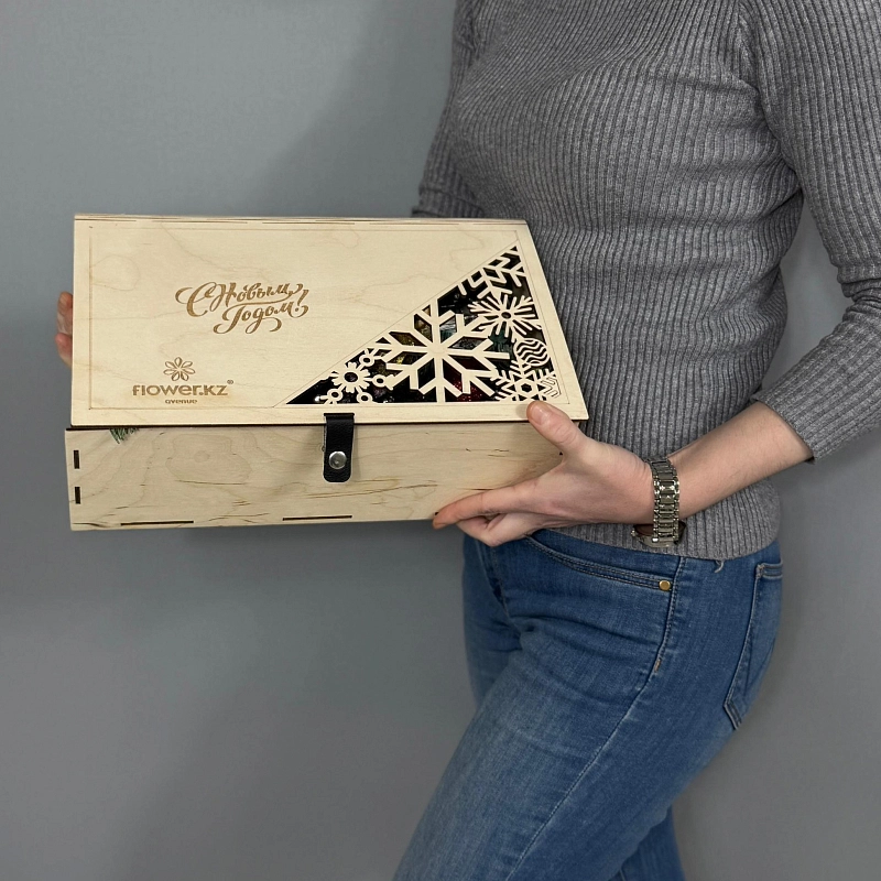 новогодний набор "holliday mood" в деревянном боксе, состав: вино игристое asti martini 1 шт, набор конфет ferrero rocher 300 г. 1 шт, набор конфет "merci" 250 г. 1 шт, набор конфе...