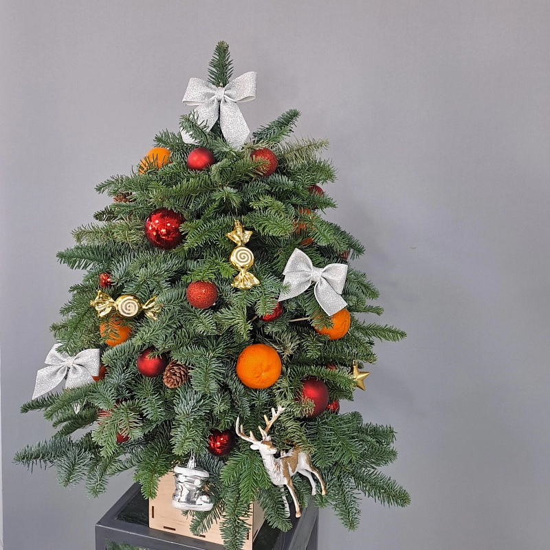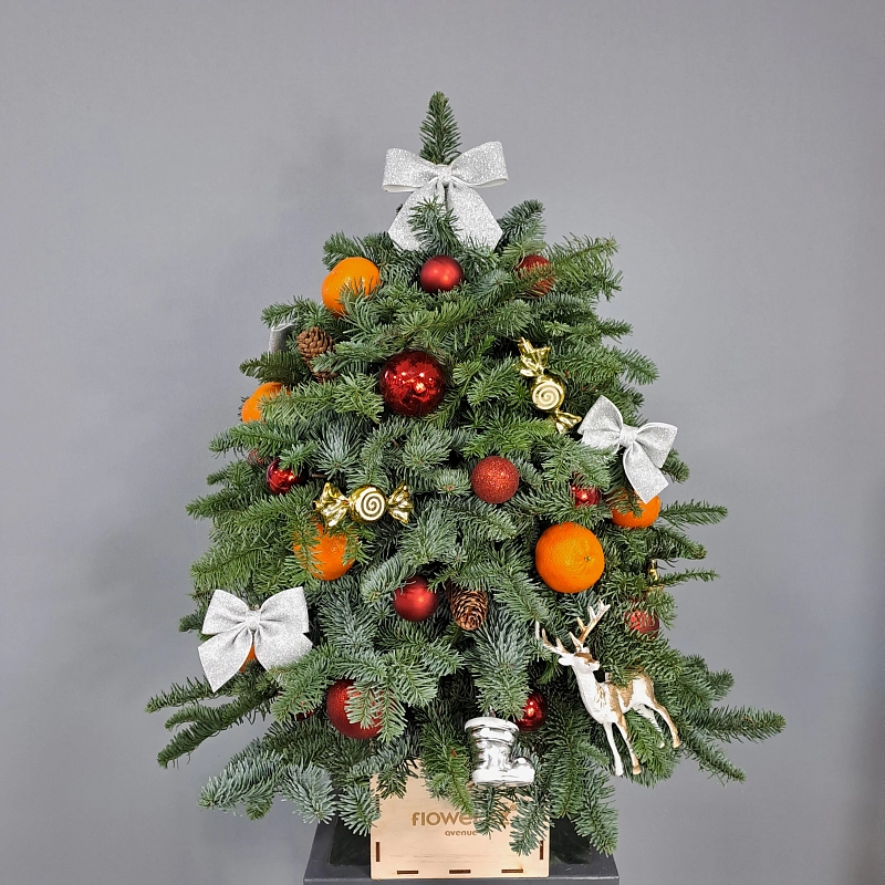 Новогодняя ёлочка "Snow Queen" — изысканная композиция в деревянном ящике, созданная для праздничной магии. Пышный натуральный елочный нобилис украшен средними и маленькими елочными шарами, натуральными мандаринами, елочными шишками и яркими бантами. Декоративные елочные игрушки добавляют особого шарма. Идеальный вариант для подарка, офиса или уютного новогоднего уголка дома.