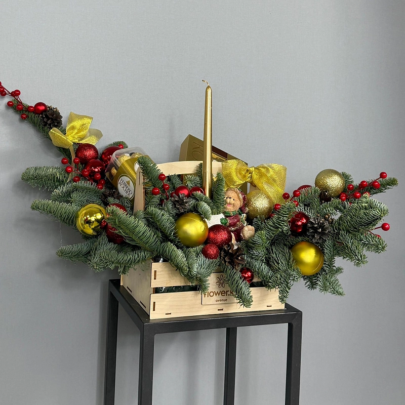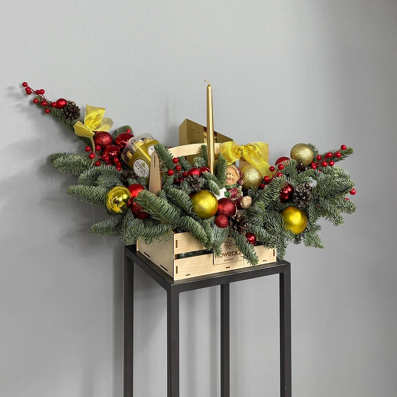 Новогодняя композиция "Merry Boom" — эффектное праздничное украшение в деревянном ящике, в составе: натуральный елочный нобилис, набор Ferrero Rocher 125 г, набор Ferrero Rocher 200 г, мини новогоднее кашпо, свеча, украшен новогодним декором в виде шишек 7 шт, елочных больших шаров 6 шт, елочных средних шаров 11 шт, елочных маленьких шаров 5 шт, декоративных ягодок, создающие яркий, насыщенный образ. Идеальна для подарка и атмосферы праздника.