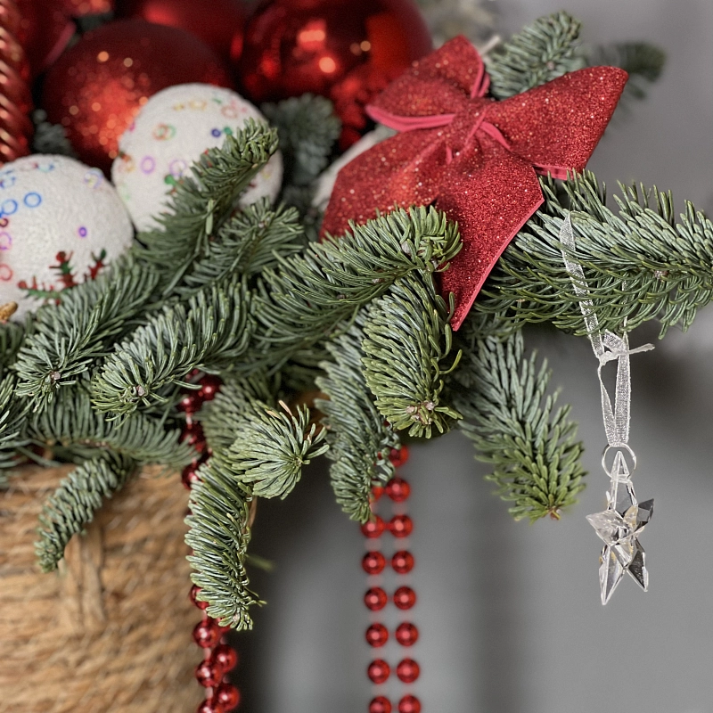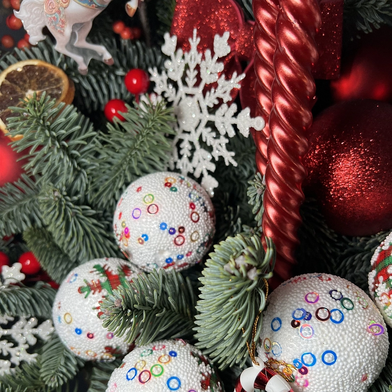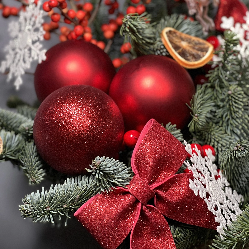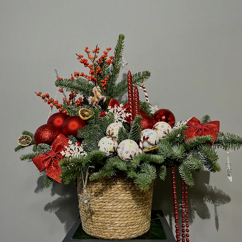 Новогодняя композиция "Snow heart" — тёплое и одновременно по-зимнему свежее украшение, наполненное атмосферой уюта и праздничной сказки. Композицию в кашпо формируют 3 шт ветки натурального елочного нобилиса и 2 шт илекса, придающие яркий зимний контраст. Декор дополняют 2 шт свечи, нити бус, 9 шт больших и 5 шт средних елочных новогодних шаров, новогодние декоративные банты, снежинки, декоративные ягодки, декоративные сушёные дольки мандарина, 2 игрушки в виде "леденеца", 3 игрушки в виде "снежной звезды2 и игрушка фигурка в виде "новогодней лошадки", создающие ощущение волшебного зимнего сердца.