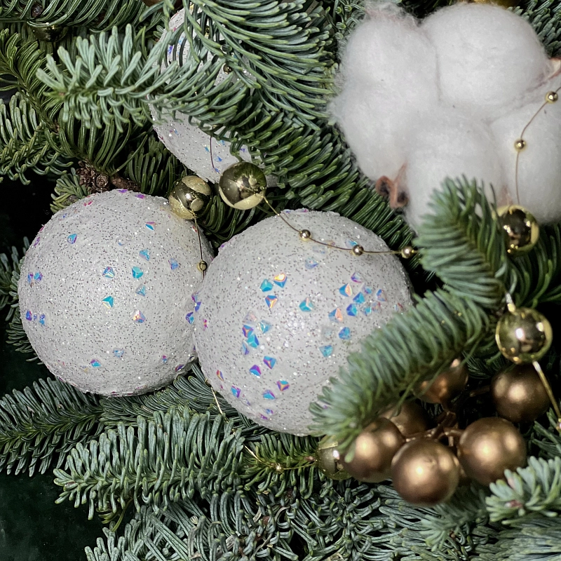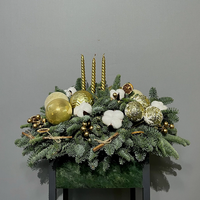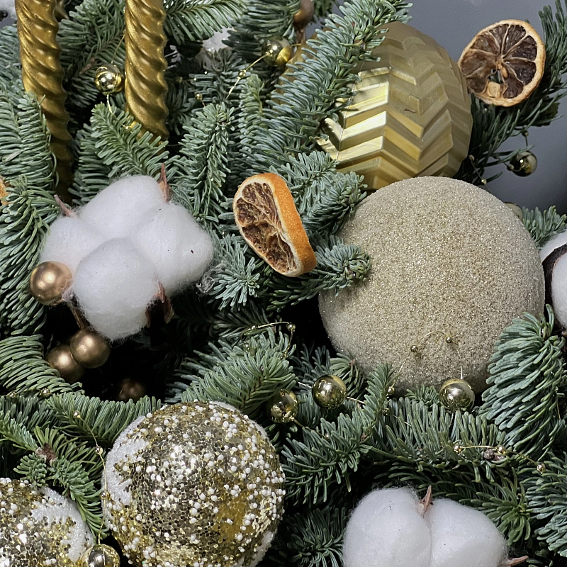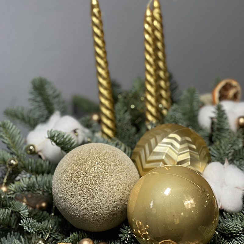 Новогодняя композиция "Золотое свечение"— тёплый и элегантный акцент праздничного интерьера, наполненный атмосферой уюта и зимнего волшебства. В составе композиции использованы 3 шт свечи, 3 ветки натурального елочного нобилиса, 5 шт больших и 6 шт средних новогодних елочных шаров в благородной золотой гамме. Натуральные акценты создают дольки сушёных мандаринов, хлопка, декоративных ягодок, нити бус и декор корицы, наполняющие пространство тонким праздничным ароматом.