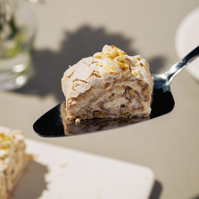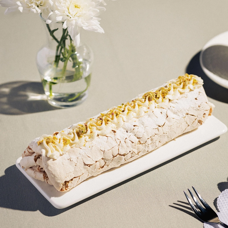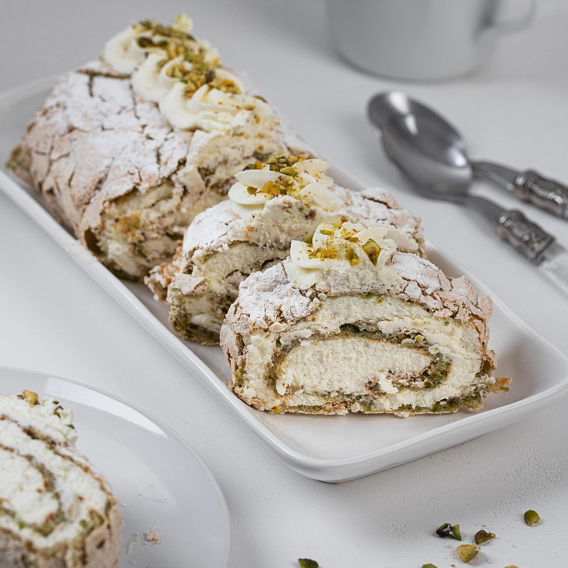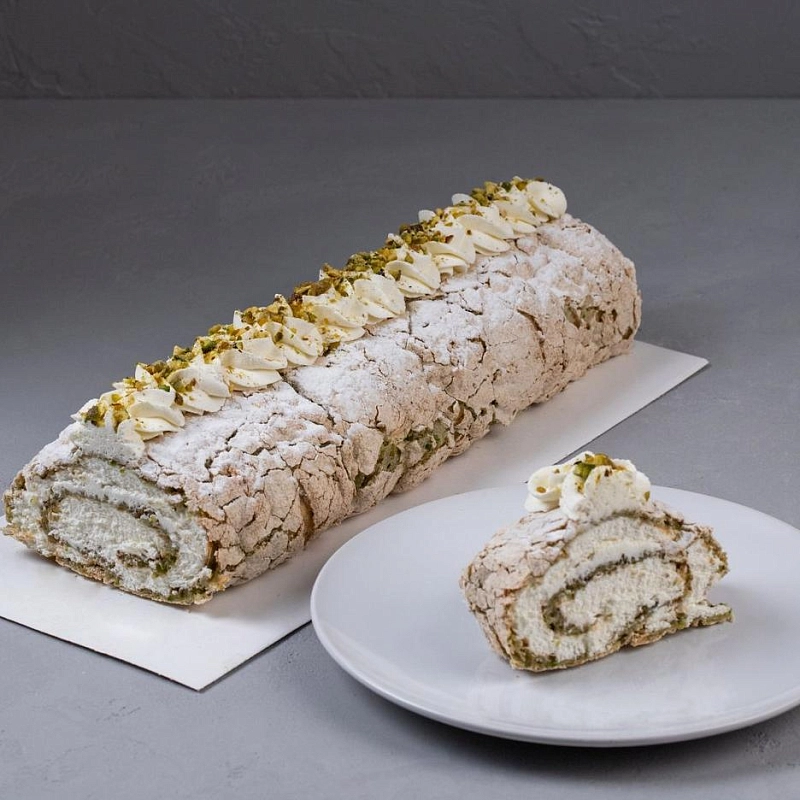 Нежный рулет с добавлением фисташек, пропитанный лёгким сырно-сливочным кремом - 550 г.