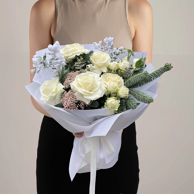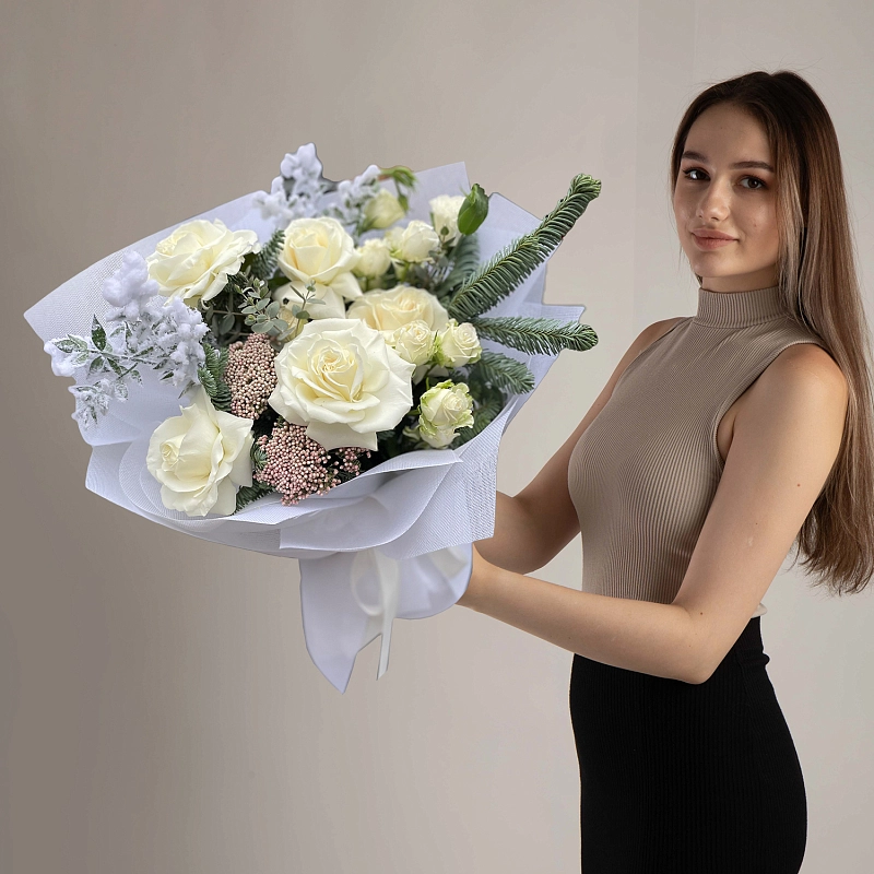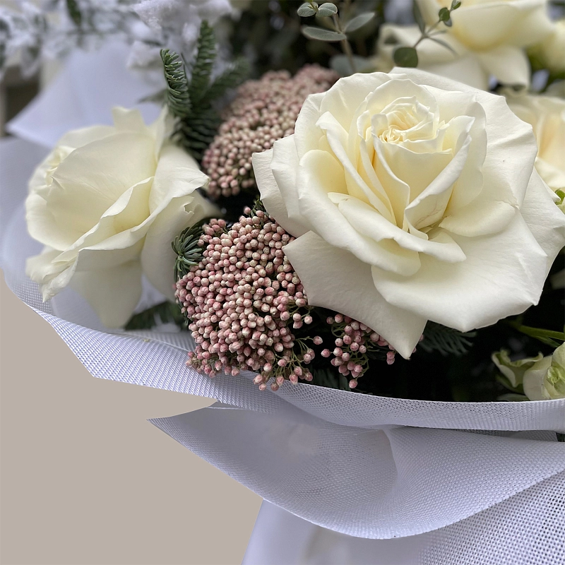 Зимний букет "Снежный румянец" состав: розы 11 шт, лизиантус 3 шт, гвоздика 4 шт, кустовые пионовидные розы 6 шт, украшенный натуральным елочным нобилисом, зимним аспагагусом, скиммией.